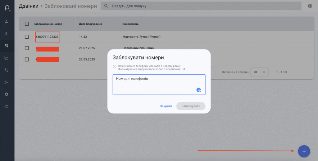 Видалити номери з чорного списку може лише користувач з правами адміністратора. Для цього необхідно перейти в розділ Чорний список з пункту 2 (рис. 2-3). І під кнопкою Додати буде список з номерів, які вже є в цьому списку. Для видалення номеру – необхідно натиснути хрестик навпроти відповідного номеру (рис. 5).